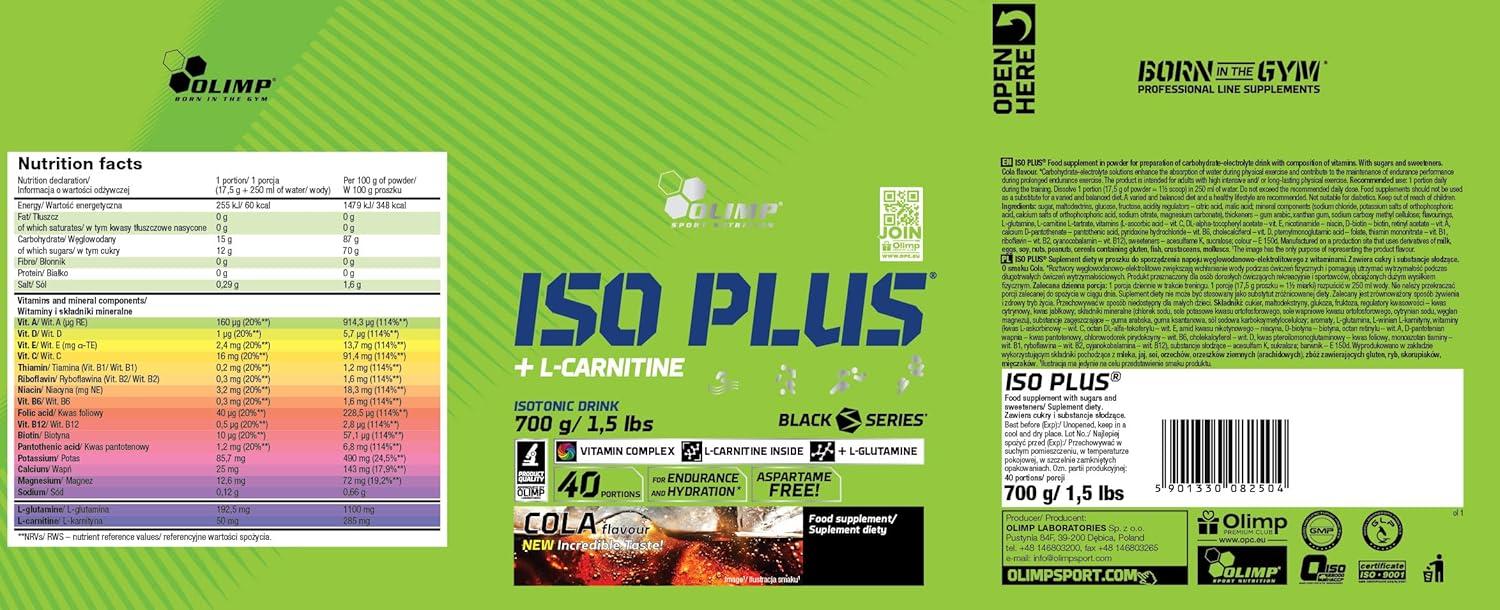 Iso Plus® Powder من Olimp Sport Nutrition هو مشروب أيزوتونيك متكامل على شكل بودرة، مصمم لدعم الرياضيين خلال التدريبات الطويلة والمكثفة. يحتوي على مزيج من الكربوهيدرات، الإلكتروليتات، السكريات، والمحليات، إضافة إلى فيتامينات ومعادن أساسية، ليضمن الترطيب، الطاقة، والحفاظ على القدرة على التحمل أثناء وبعد التمارين.