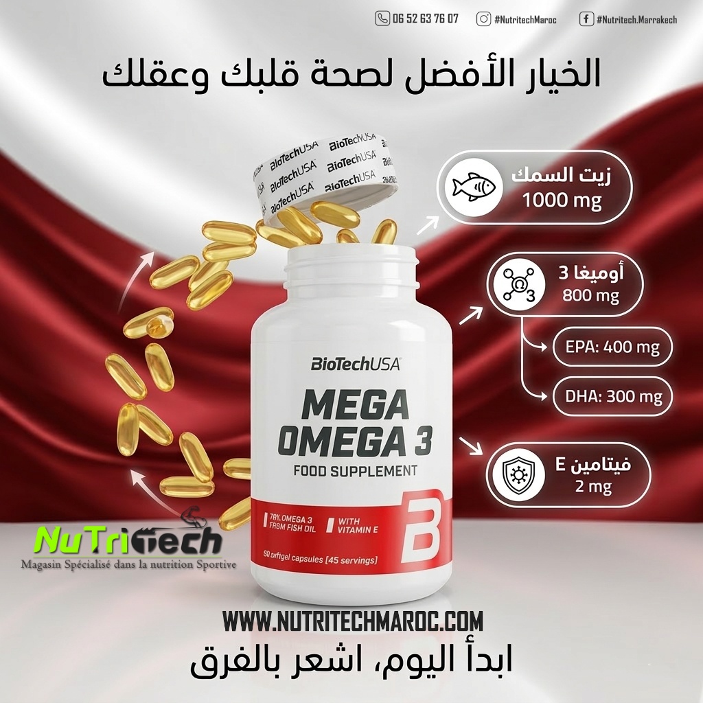 BioTech USA Mega Omega 3 90 Softgels مكمل غذائي عالي الجودة غني بأحماض EPA وDHA الأساسية لدعم صحة القلب والدماغ وتحسين الاستشفاء العضلي. بفضل تركيزه العالي من زيت السمك، يساعد على تقليل الالتهابات الناتجة عن التمارين، دعم الأداء الرياضي، والمساهمة في توازن الكوليسترول.