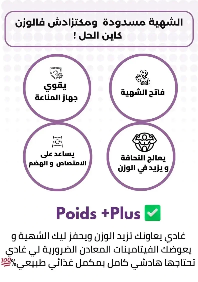 - آمن وفعال: تم تصنيع Poids Plus من مكونات طبيعية آمنة على الصحة وفعالة في زيادة الوزن.
