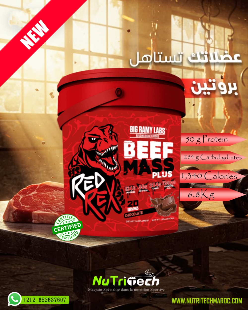 - Red Rex – Beef Mass Plus 2.7kg: ماس جينر غني بالبروتين والكربوهيدرات لدعم نمو العضلات واستشفاء أسرع.
