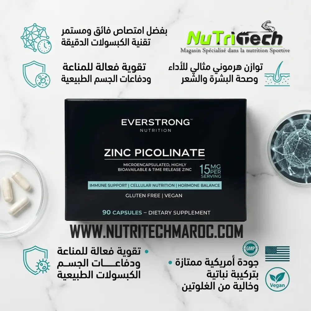 يُعد Everstrong Zinc Picolinate من المكملات الغذائية عالية الجودة التي توفر الزنك في شكل بيكولينات، وهو أحد أكثر الأشكال قابلية للامتصاص في الجسم.